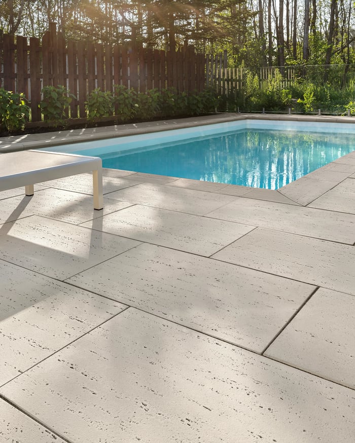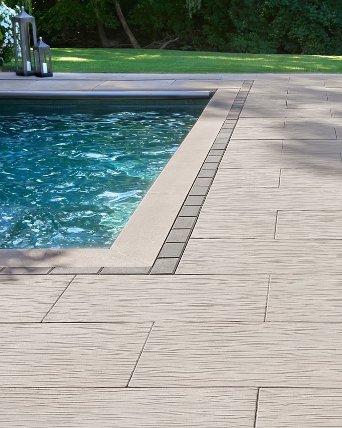 Mixing textures is a fantastic way to add depth to your backyard pool area. Pair wood-look pavers like Borealis with chiseled texture like Traverina Raw for a layered, custom appearance.