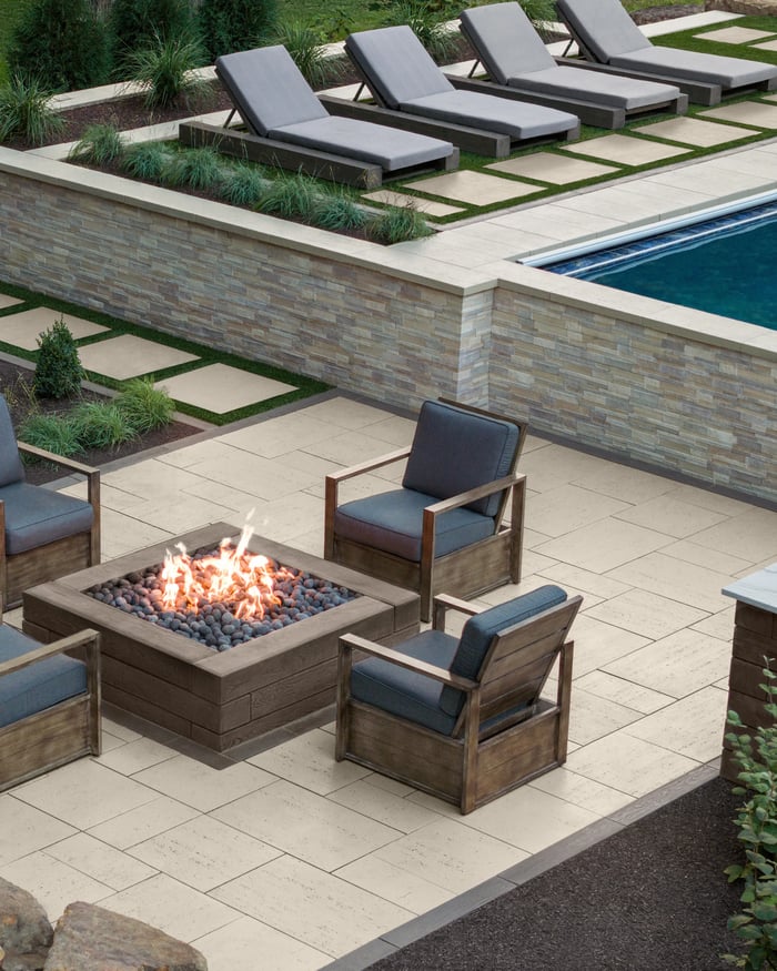 Try natural-looking options like Travertina Raw from Techo-Bloc. These add charm, durability, and a seamless flow through your outdoor space—while enhancing your backyard design with pool features.