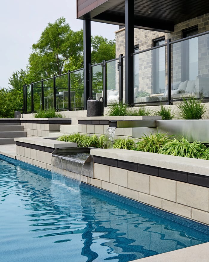 Use modern planters or build custom beds with Borealis wall systems to create an organized, vibrant border around your backyard swimming pool.