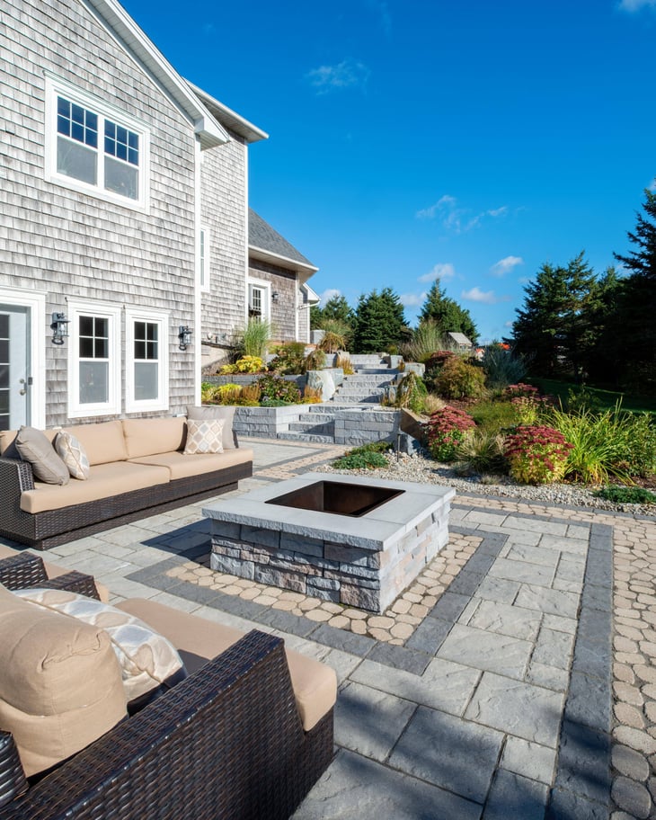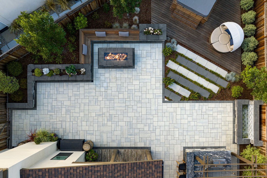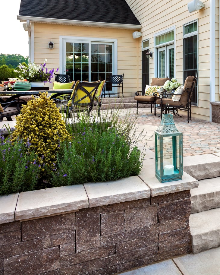 Designing a small backyard with a cozy focal point? Use your retaining wall to frame a built-in fire pit. The Prescott Wall pairs very well with other types and colors of pavers. Bonus: a fire pit adds warmth and usability, turning your retaining wall into a true lifestyle feature.