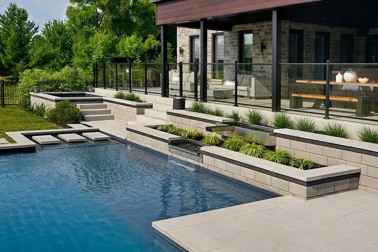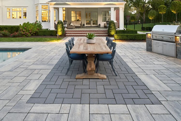 Featured products: Blu Grande Smooth patio slab and Raffinato Smooth retaining wall